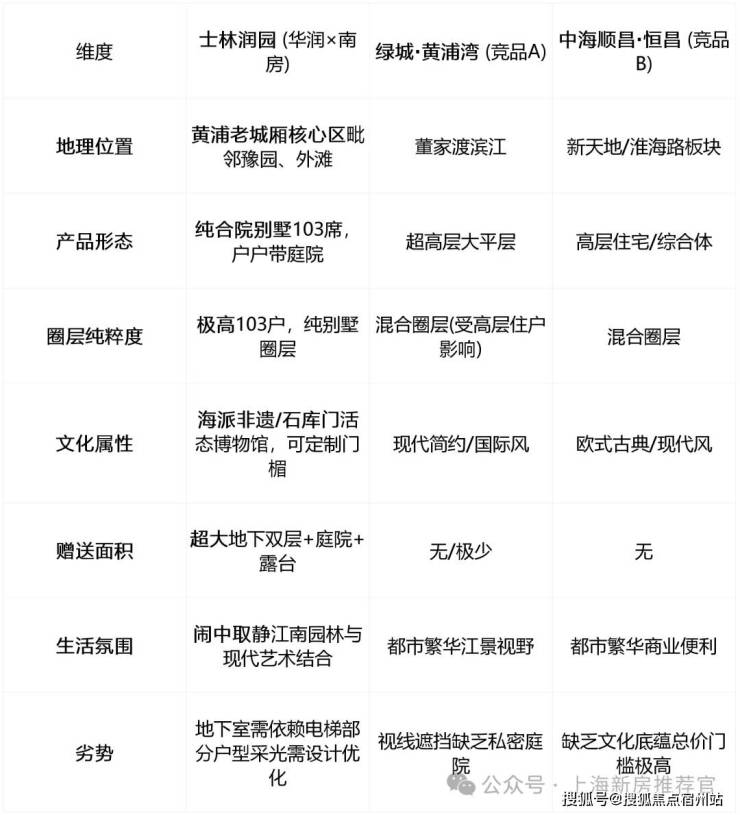 为了客观评价士林润园,我们选取了同区域的 绿城·黄浦湾 (代表一线滨江大平层)和 中海顺昌·恒昌 (代表新天地板块豪宅)进行对比。