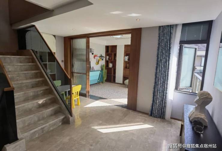 该户型二楼南向卧室有多面采光,这在上海极为少见。超长露台连接起两个卧室,如果家里有两个孩子,各自一个卧室,共通露台供其玩耍,别提有多开心。