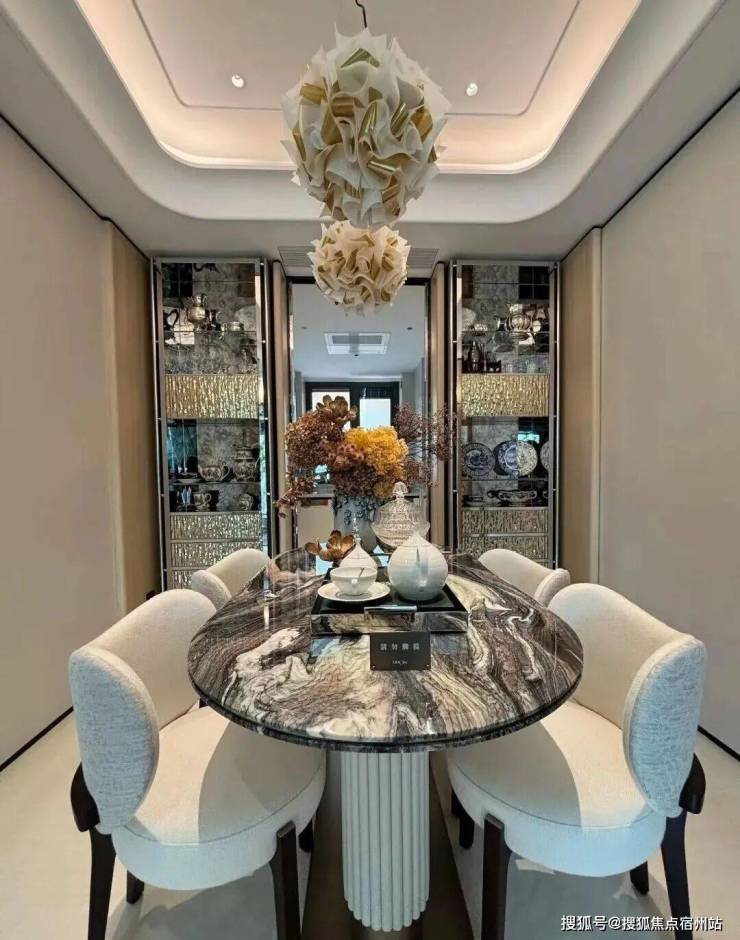 例如入户玄关铺设有“石材皇后”鱼肚印象,这种级别的奢石在很多项目中通常仅作局部镶嵌。