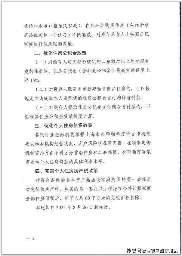 为更好满足居民刚性住房需求和多样化改善性住房需求,促进房地产市场平稳健康发展,8月25日,市住房城乡建设管理委、市房屋管理局、市财政局、市税务局、人民银行上海市分行、市公积金管理中心等六部门联合印发《关于优化调整本市房地产政策措施的通知》(以下简称《通知》),包括调减住房限购、优化住房公积金、优化个人住房信贷以及完善个人住房房产税等政策。《通知》自2025年8月26日起施行。