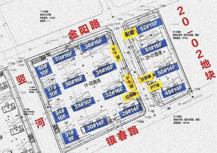 19-05地块:拟建7栋16F高层住宅、3栋9F高层住宅、1栋14F高层住宅、1栋10F高层住宅以及若干配套用房。