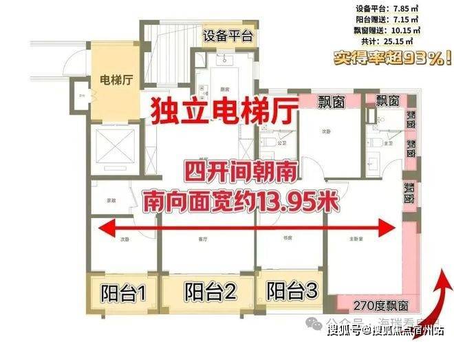 类一梯一户的独立电梯厅+约13.95米南向大面宽+三阳台和设备平台的超高实得率+270度全景舱视野+超高效收纳,实得率超93%!