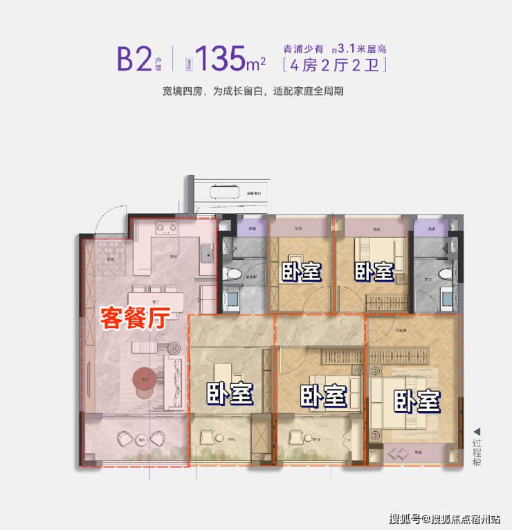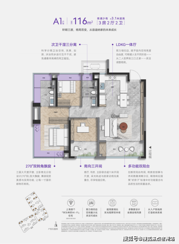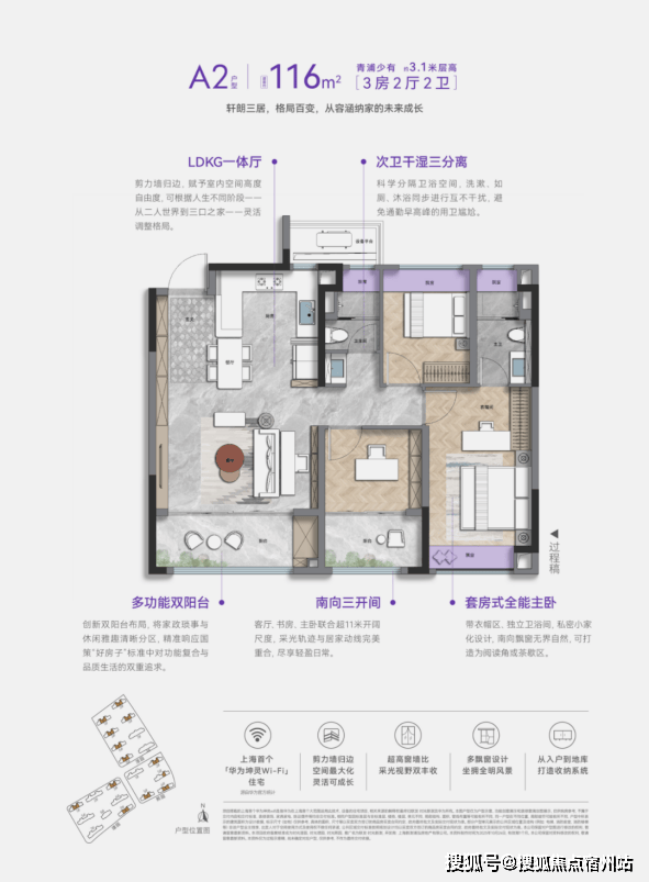 全户型最低3.1米、大户型达3.3米的层高,高于新规要求的3.0米,在整个青浦都属于极少数。