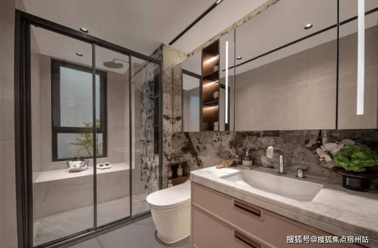 卫浴选用科勒、唯宝、高仪等国际知名品牌,智能马桶、恒温花洒带来舒适体验,镜柜延伸至整个墙面,台下盆预留收纳空间,洗漱用品、护肤品等都能各归其位,保持空间整洁。