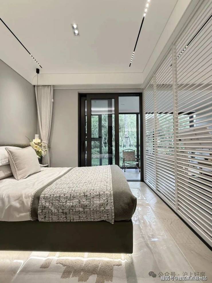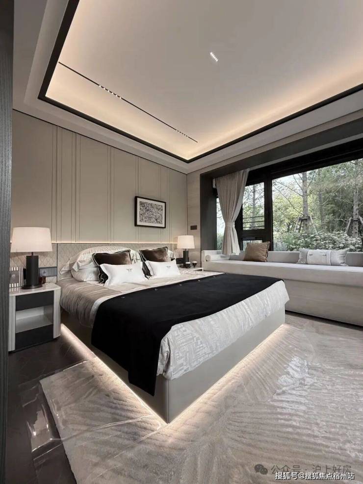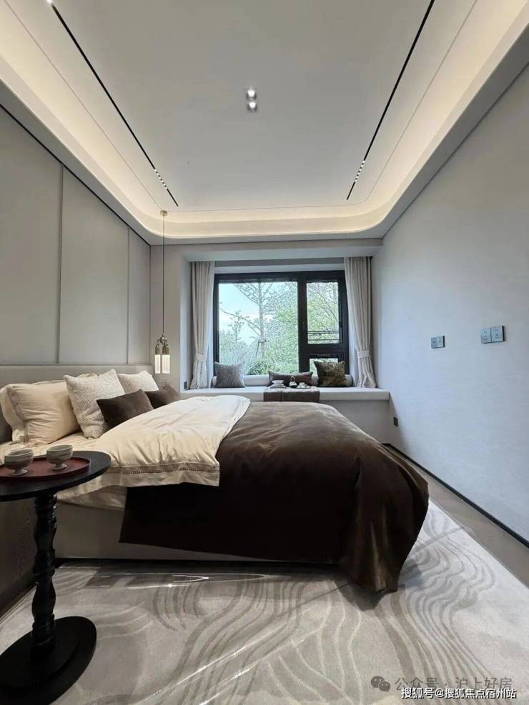 主卧转角落地窗+飘窗,也算是非常少见的了。净面宽约3.6m,不算进门的衣柜,进深大约5.7m左右。根据测算,可以放置宽约2m的床+2个床头柜(宽度约45cm/个)是可以的。