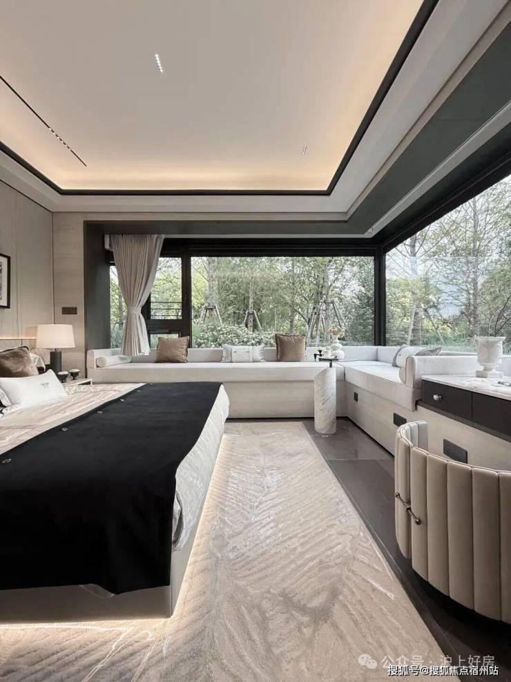 其中主卧的270°转角飘窗就有约5.7m²,通过与外立面的结合,直接做了梳妆台和储物柜,拓展了飘窗的实用性。