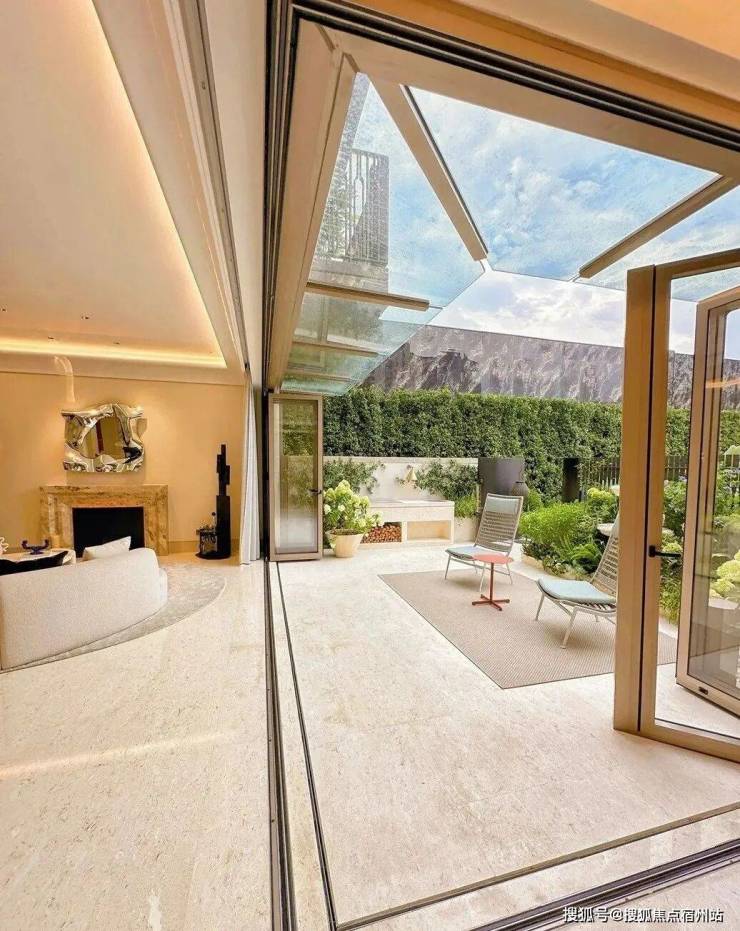 「无界空间」:客厅270度转角无柱设计,搭配落地玻璃,开阔视野将院中风景迎入日常。