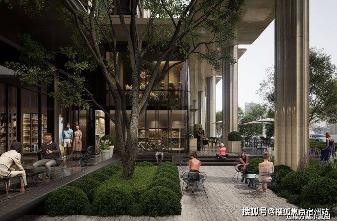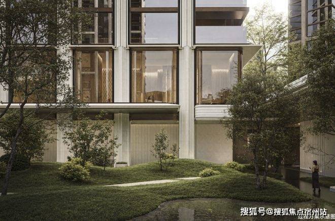 穿过园林,上海最大的约3500㎡下沉水院构成社区的核心灵魂,约13米的高差形成独特的“峡谷绿洲”,将黄浦江的水意象引入社区,中央平静水面与四周的会客舱、茶室、游泳馆形成呼应。