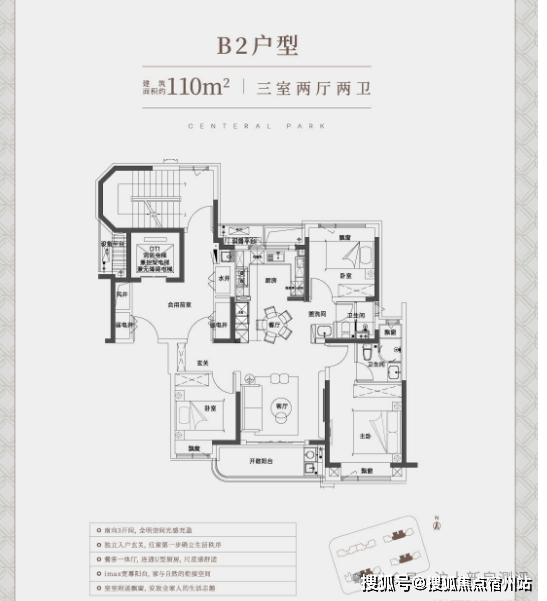 建面约110㎡户型(B1边套/B2中间套),均实现南北通透,三开间朝南,保证室内阳光充沛、空气流通。