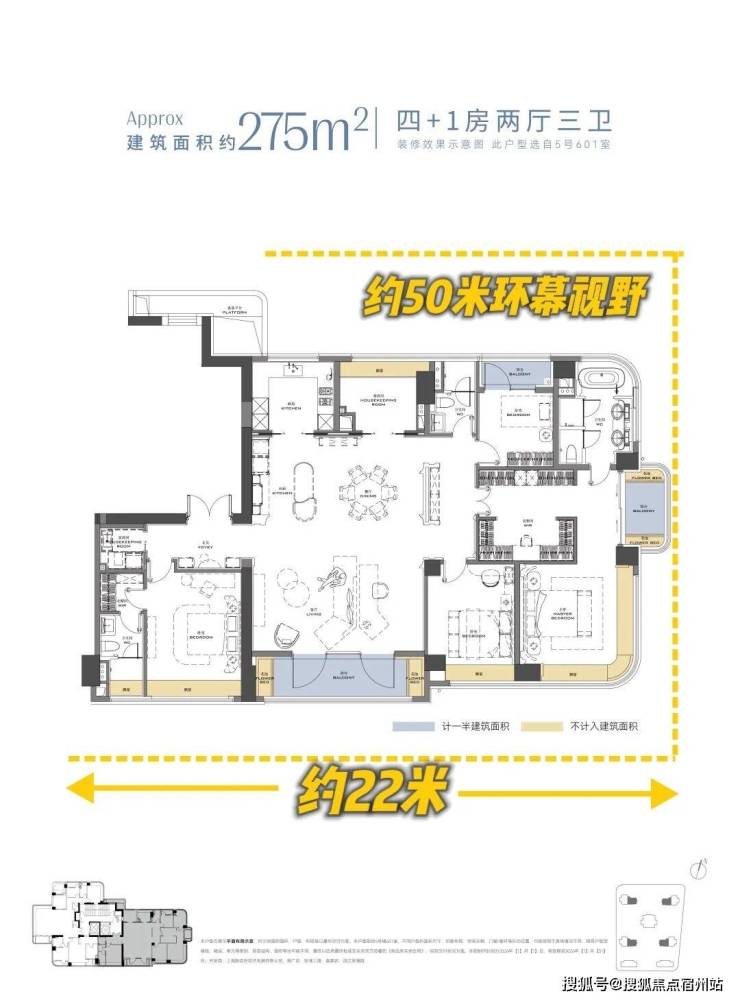 275㎡户型 全屋约50米环幕视野,南向约22米采光!