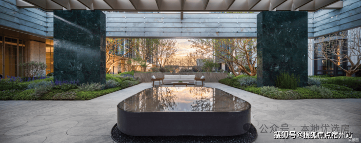 庭院中遍布着睡莲,从这里往出去像一幅画,高低层次的叠水景观,超大型的原石,还有私密的谈话空间,舒适惬意。