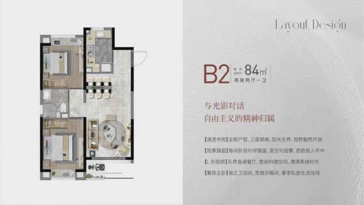建面约84㎡2房2厅1卫,做到了双开间朝南+双卧室带飘窗+动静分离,非常宽敞的2房户型。☑️☑️大名城·映雨江南售楼处电话:400-1183-605☑️☑️