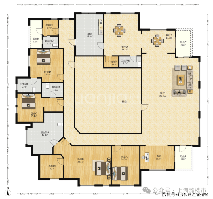 由5幢小高层组成,总共108户,总户数少而精,保障居住的纯粹性与私密性。3、5号楼为一层两户南北通板式户型,1、2、6号楼为一层一户点式住宅,总高21F。总建面7万平方米,配设5000平米日式中庭花园与2000平米空中花园,打造出自然与建筑相融的居住环境。户型面积涵盖260-700平方米,多样户型满足不同塔尖人士需求: