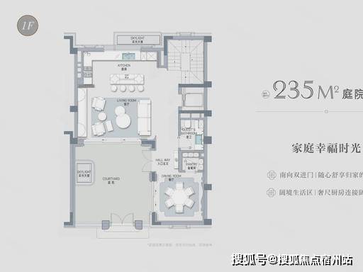 南向面宽约 12 米,客餐一体约 80㎡,U 型厨房设计