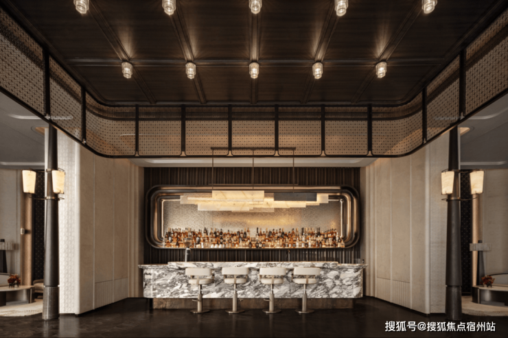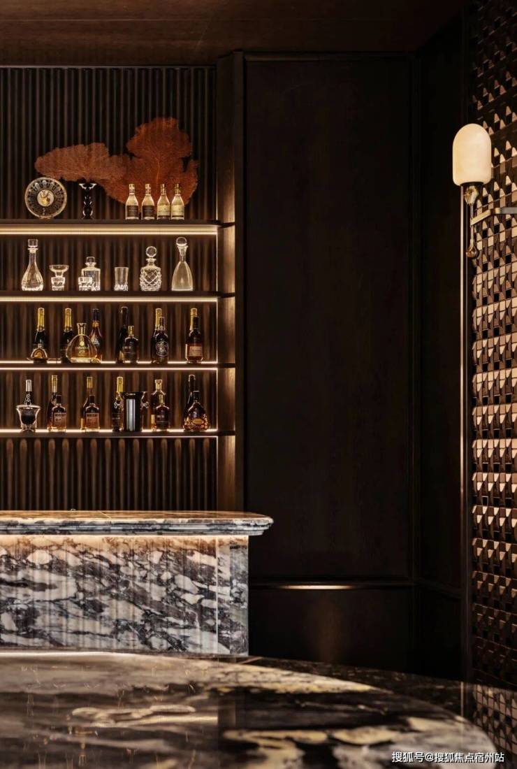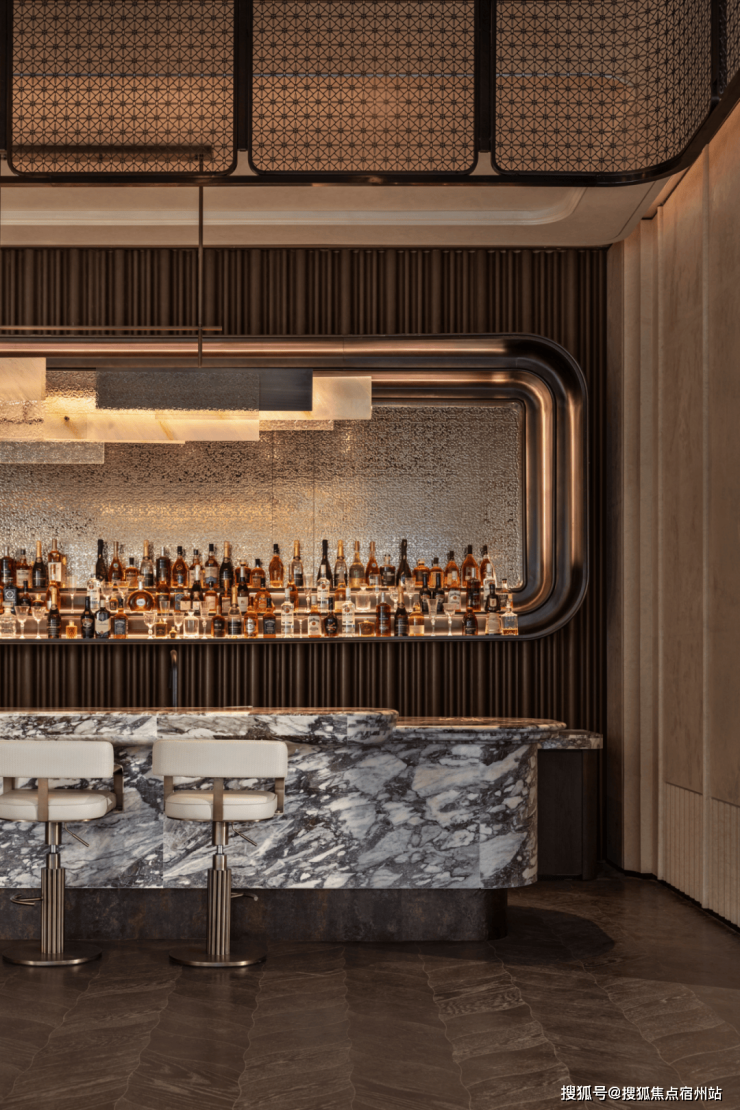 一以贯之的弧形线条,形成了统一的设计语言,立体的天花设计与水吧细节勾勒出上海的精致与摩登,设计灵感源于“沪上繁花“的意象,将藏酒陈列与灯光不着痕迹地融于一体,举重若轻地统摄着空间气质,宛如一场奢华的梦幻之旅。