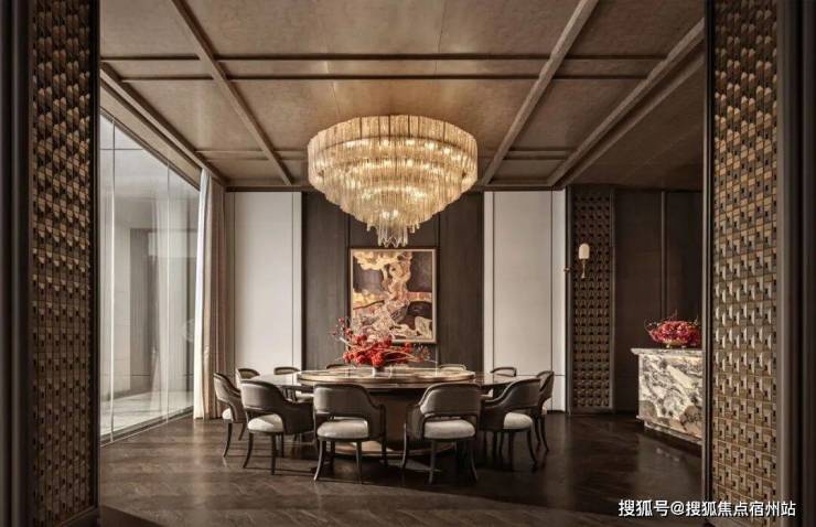 以沉稳奢华为底,既承载大时代的风云变化,亦包容家庭的脉脉温情。仪式感的酒架与屏风的植入,将东西方“藏与秀”的文化物化,灵活且考究。谈笑间显风雅,觥筹间映繁华。