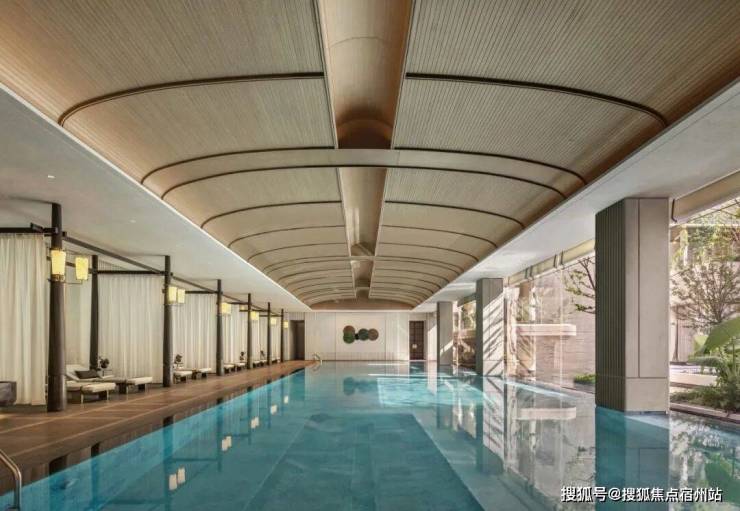 会所内设泳池在内的系列健身中心,墙面与天花的柔和石材与浅木色调,以及白色帷幔,共同弱化了时间的急促感。极简的泳池位与柔光给予最私密而惬意的“奢华酒店度假感”,畅游间可饱览庭园意趣。
