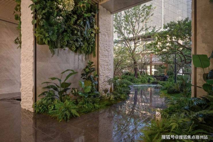 藤蔓沿墙垂落,水流自然流入,花草在架空层间摇曳生姿,使这一开放场域成为生机盎然的灵动空间。