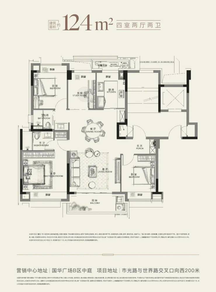 建面约124㎡的一步到位改善四房,三开间朝南设计,主、次卧互不干扰;南北通透的超大尺度公区,各种生活场景均可在此实现;得益于洋房产品属性,得房率会相对较高,功能性4房设计,无论是三代同堂或是二胎家庭即可容纳。