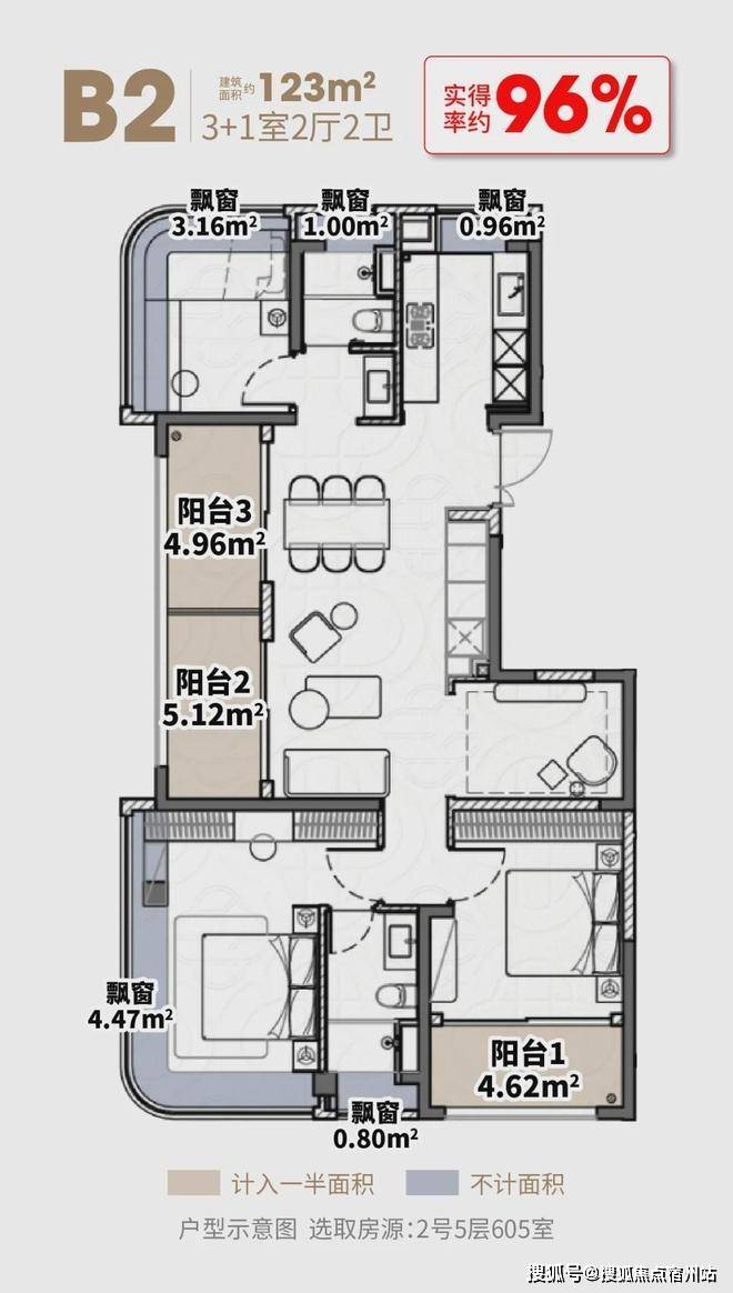 建面约123㎡4房,三阳台面积达约14.7㎡(赠送一半),5飘窗赠送高达约10.4㎡,室内使用面积约117.8㎡,实得率高达约96%,总赠送面积相当于两个次卧。