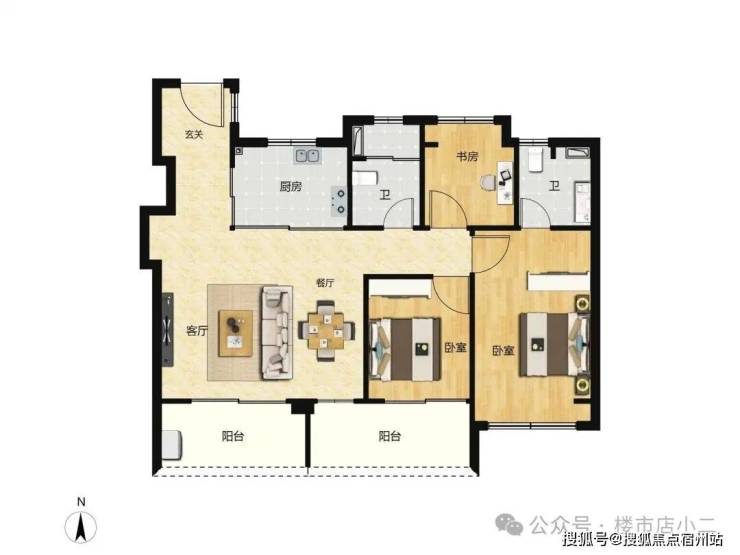 建面约101㎡ 的三房户型设计有朝南双阳台,进门就有阔绰收纳空间,利用率极高。