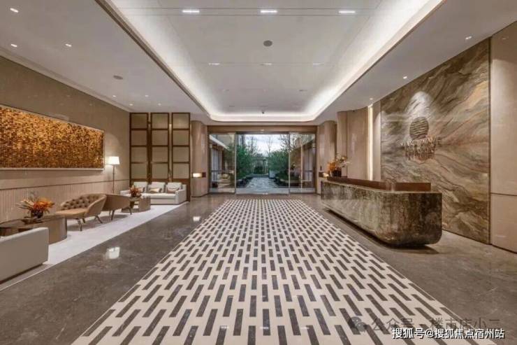 归家的第一道仪式感来自“绮丽门庭”命名的酒店式入口大堂。这里顶部采用香槟金色斜角造型铝板,搭配手工打磨的星空顶及氛围灯,墙面借鉴了华尔道夫酒店的浅米黄色系大理石。