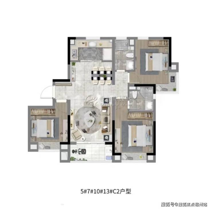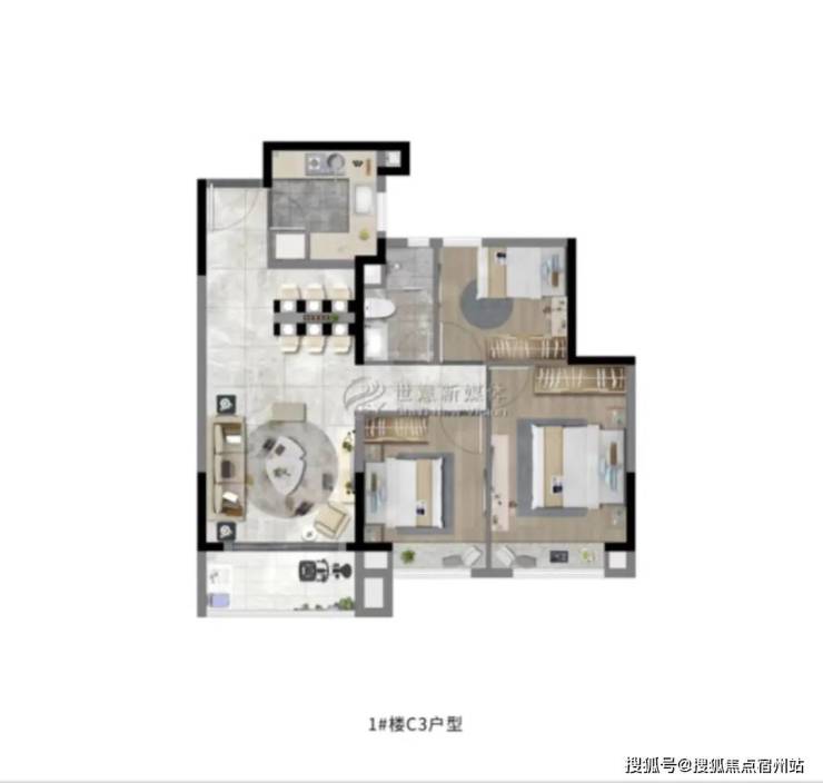 建面约108㎡3房2厅2卫,做到了 三开间朝南+双阳台设计+主卧套房设计+南北通透 ,该户型得房率非常高。
