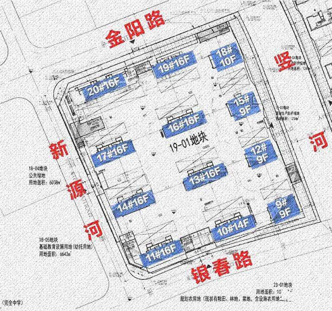 19-01地块规划:拟建7栋16F高层住宅、3栋9F高层住宅、1栋14F高层住宅、1栋10F高层住宅以及若干配套用房, 规划住宅套数下限622套。