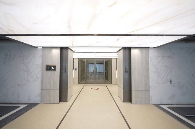 电梯厅墙面大面积铺设岩板,质感拉满。