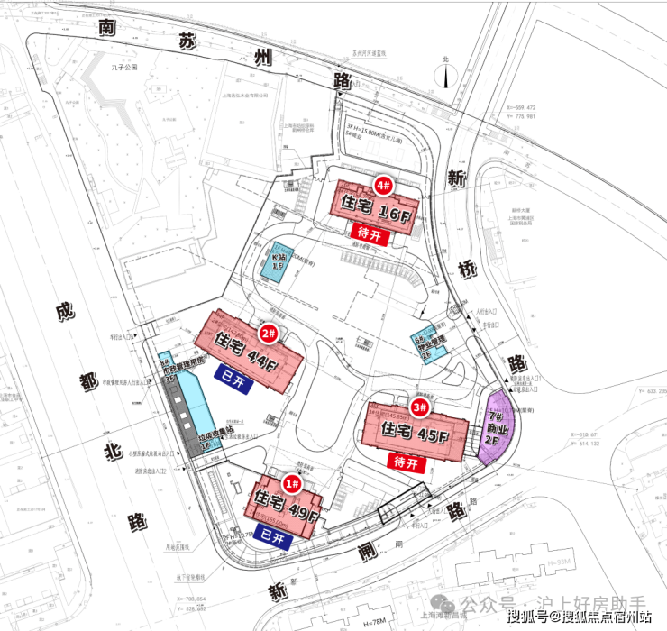 1#地块:分为南北两块:南块,东至新桥路,南至新闸路,西至成都北路,北至成都北路1012弄;北块,东至新桥路,南至新桥路51弄,西至九子公园,北至南苏州路。 未来主力产品为超高层住宅。