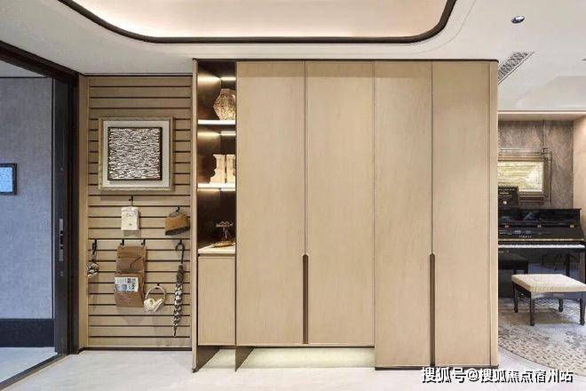 在收纳系统上,构建了涵盖玄关“多功能条板收纳墙”