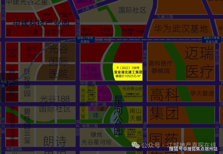 因此,在2022年12月16日的光谷土拍中,P(2022)108这宗 绝版地块,经历了9次竞拍,竞得总价 11.999亿元,溢价率 约3.45%,楼面价 约10525元/㎡,最终幸运的落到了实力强劲的宝业集团手中, 瞬间引爆整个光谷地产圈!