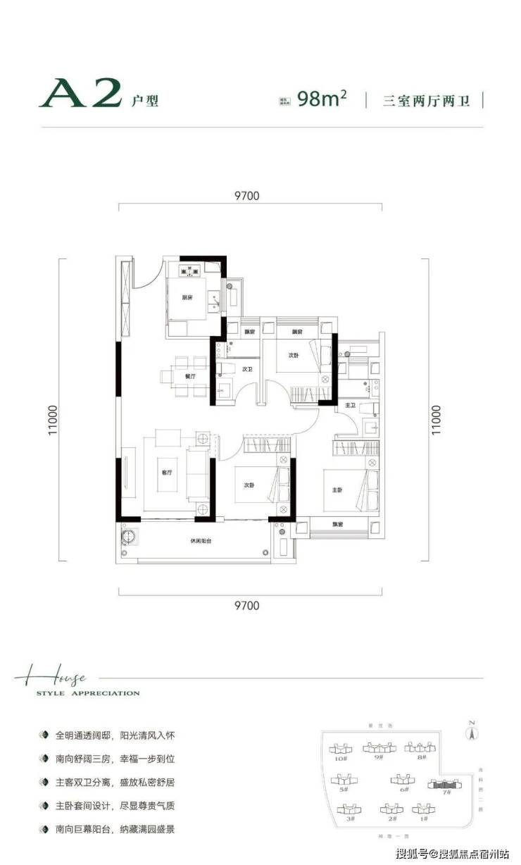 由9栋20-26层的高层组成,住宅容积率仅约2.5。在售建面约98㎡、110㎡、127㎡、140㎡四个户型,层高3米,远高于目前市面主流约2.8米。