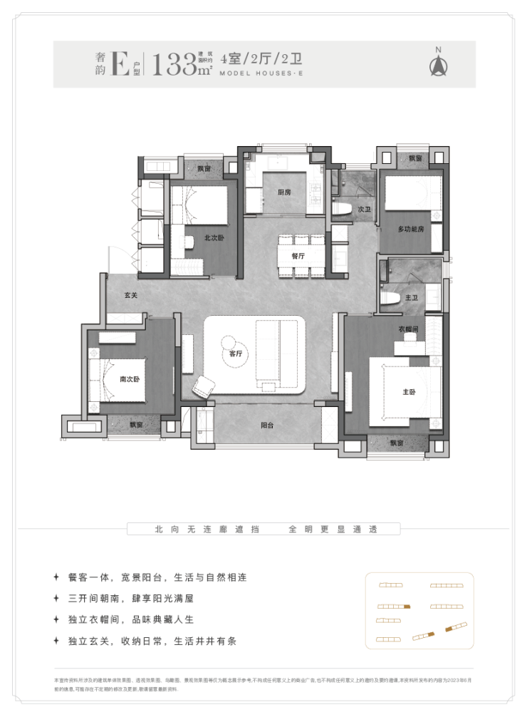 建面约133㎡4房2厅2卫,升级改善大四房。南向总开间约12.8米,四叶草布局,全明通透,动线清晰。