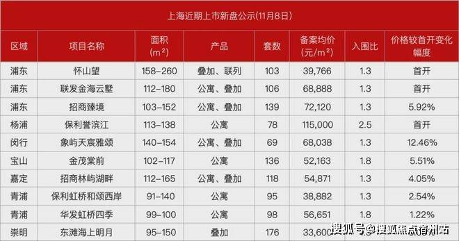 价格方面,备案均价最高的是杨浦区的保利誉滨江,为11.5万元/㎡;推出套数最多的是崇明区的东滩海上明月,共176套;总货值最高的为浦东新区的招商臻境,约11.78亿元。