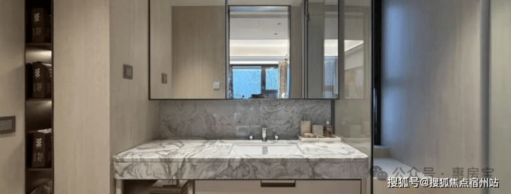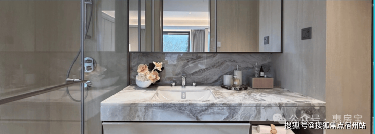 主卫墙面采用 大块防洞石岩板,石材地面,铝合金材质通顶镜柜,并内置美妆冰箱;