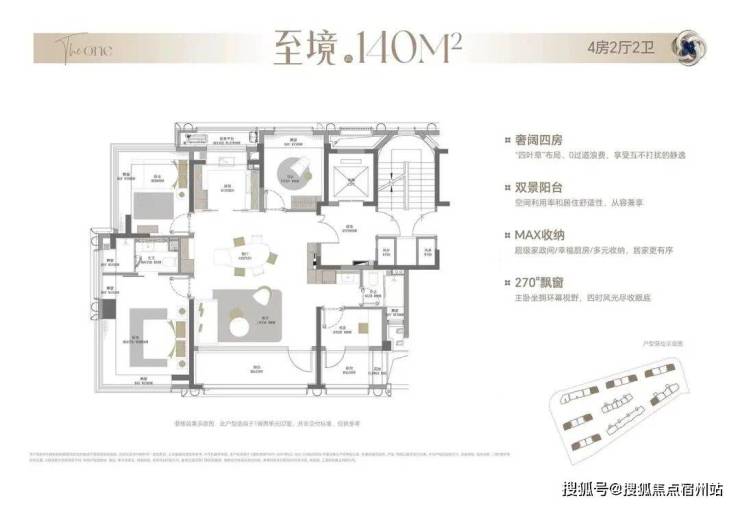 140平4房2卫生户型升级了空间和装标,采用利用率更高的四叶草布局,整体南向面宽达到约14米,南北双270度视野采光很充足。