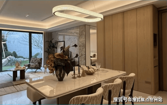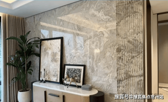 客餐厅空间高标准交付,其中: 电视背景墙采用安第斯雪景仿奢石大块岩板(融创外滩壹号院4000万+豪宅同款)+褶皱石材包边;