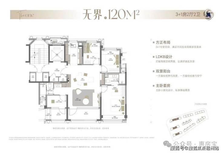 重点说一下户型样板间, 120平3房2卫户型采用空间更合理的竖厅结构,南向开间到达约4.8米,南向双阳台拓展,结合3.1米层高进入客厅空间感很足。
