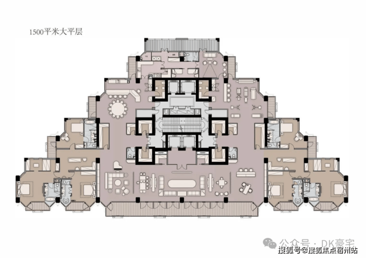 最豪气的还是这个整层一户 建面约1500㎡的大平层户型。它南向面宽达60米,有14个阳台!