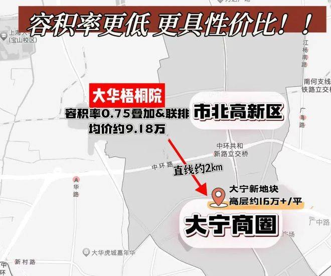 02、其次,项目与市北高新区&大宁商圈的直线距离仅约2km,大宁高层的价格可以买到大华梧桐院的高阶改善别墅!