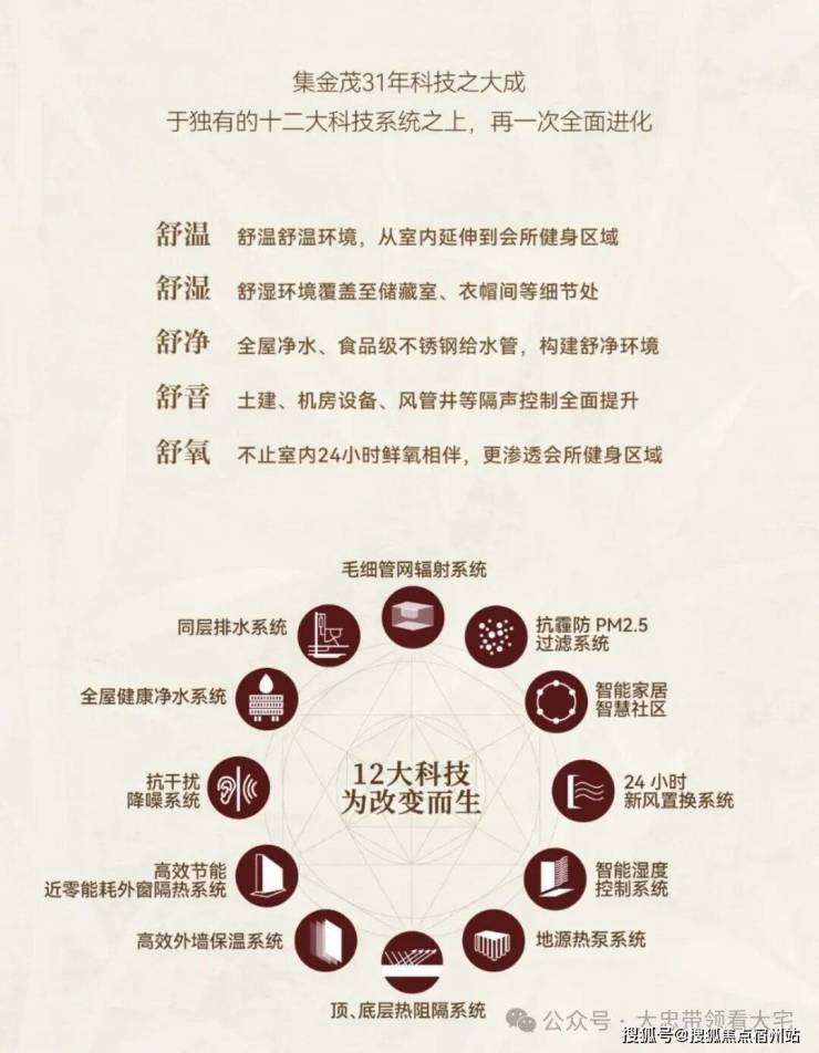 从“ 温度、湿度、空气、阳光、水、声音 ”六大基本生命元素延伸 12大科技体系 ,实现“ 舒温、舒湿、舒氧、舒净、舒音 ”的居住环境。