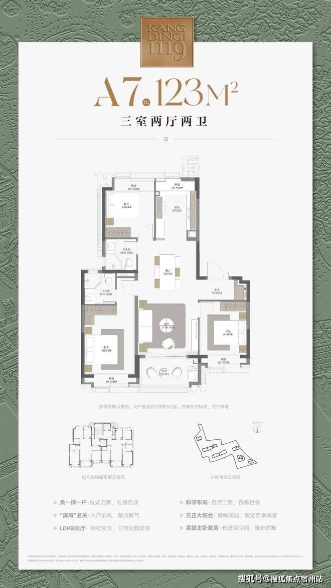 建筑面积约123㎡三房户型,飞机式布局,一镜到底的LDKB长厅,尽显隐贵静安风范;