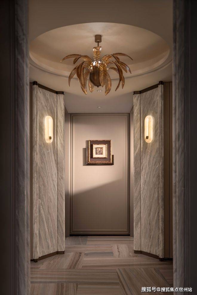 经典十字序列厅:从私享电梯厅开始,经由对开入户门,首先就进入这样一个十字序列厅,视线远处,就是尽头观景台,这条长廊,可以是公私分区的交通枢纽,也可以是彰显主人品味的艺术长廊;