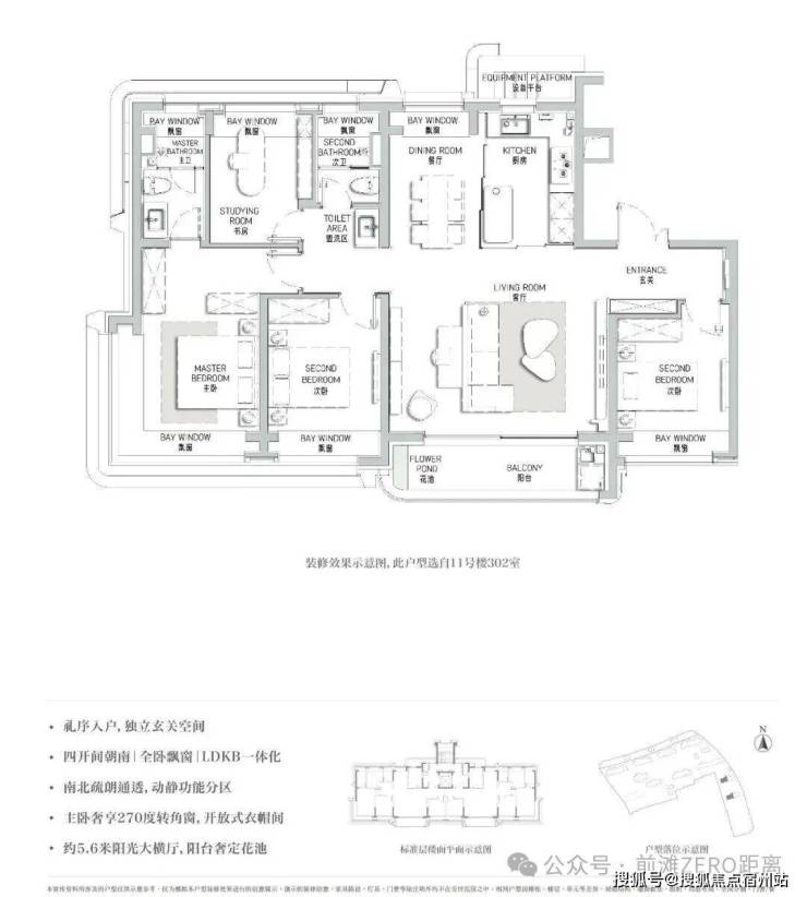 3、南向四开间,面宽约15.5m,独立餐客厅,南北通透