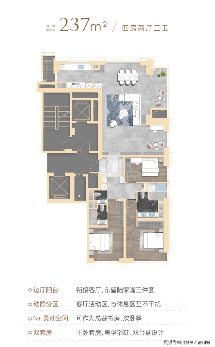 项目主打纯改善云端大平层,建面覆盖多元户型,全系南北通透、全明采光,无小户型混杂,圈层纯粹度拉满。