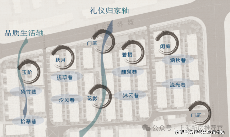 “碧梧、花影、秋月、玉阶、闲庭”五大院落,定制八巷生活场景,包括流光巷、涵秋巷、沐云巷、酌泉巷、汐风巷、抚草巷、拾翠巷、猗竹巷。