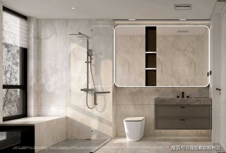 配备美妆龙头,大容量镜柜可收纳洗漱用品,利用墙面空间设置壁龛,便于存放毛巾、衣物便于取用。