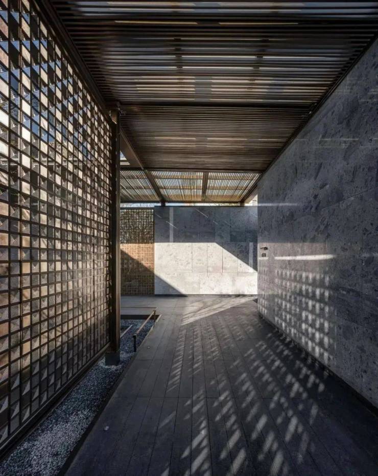 厅堂和轩堂,也在这番赏景过程中,毫不突兀地依次出现。前者还原出孔子树下讲学的场景,后者则用金属编织的卷帘搭配青绿色彩釉玻璃,构建出一个品茗厅琴的空间。这一切来得如此自然、连贯,富有节奏和层次,把园林艺术的本质抓得入木三分。