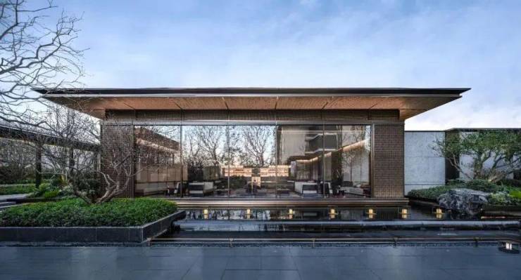 从门堂进入之后,一整面玻璃幕墙将山水隐园的景色框定在眼前,开阔的视野立刻带来了强烈的视觉冲击。慢慢深入之后便会发现,眼前景色随着脚步一点点发生变化,心情也不知不觉跟着产生微妙的起伏,真正做到了“移步异景”的效果。